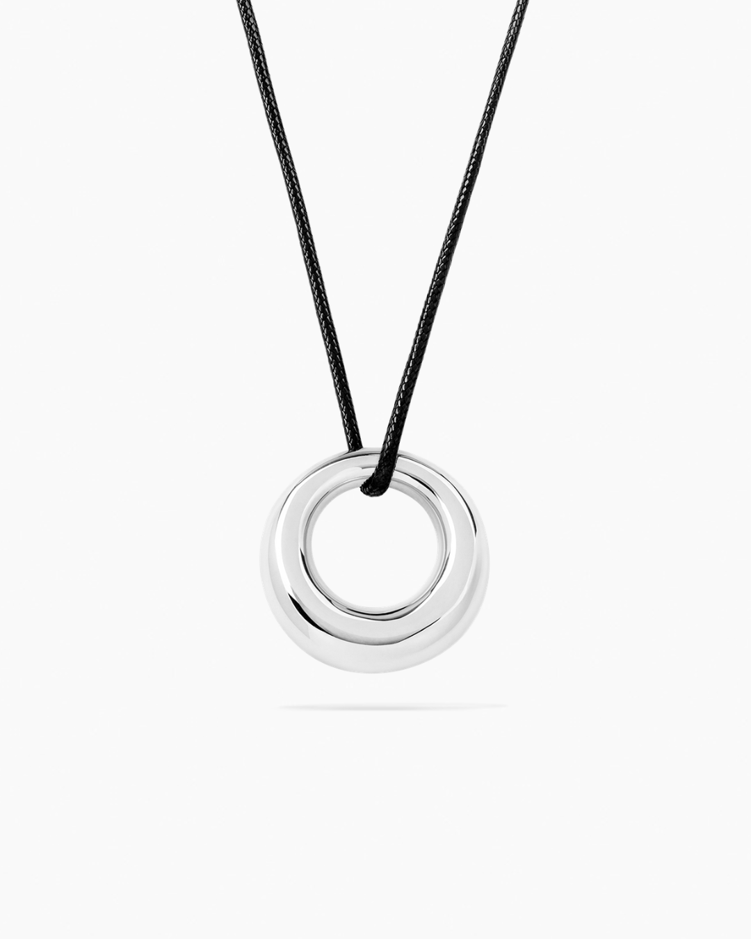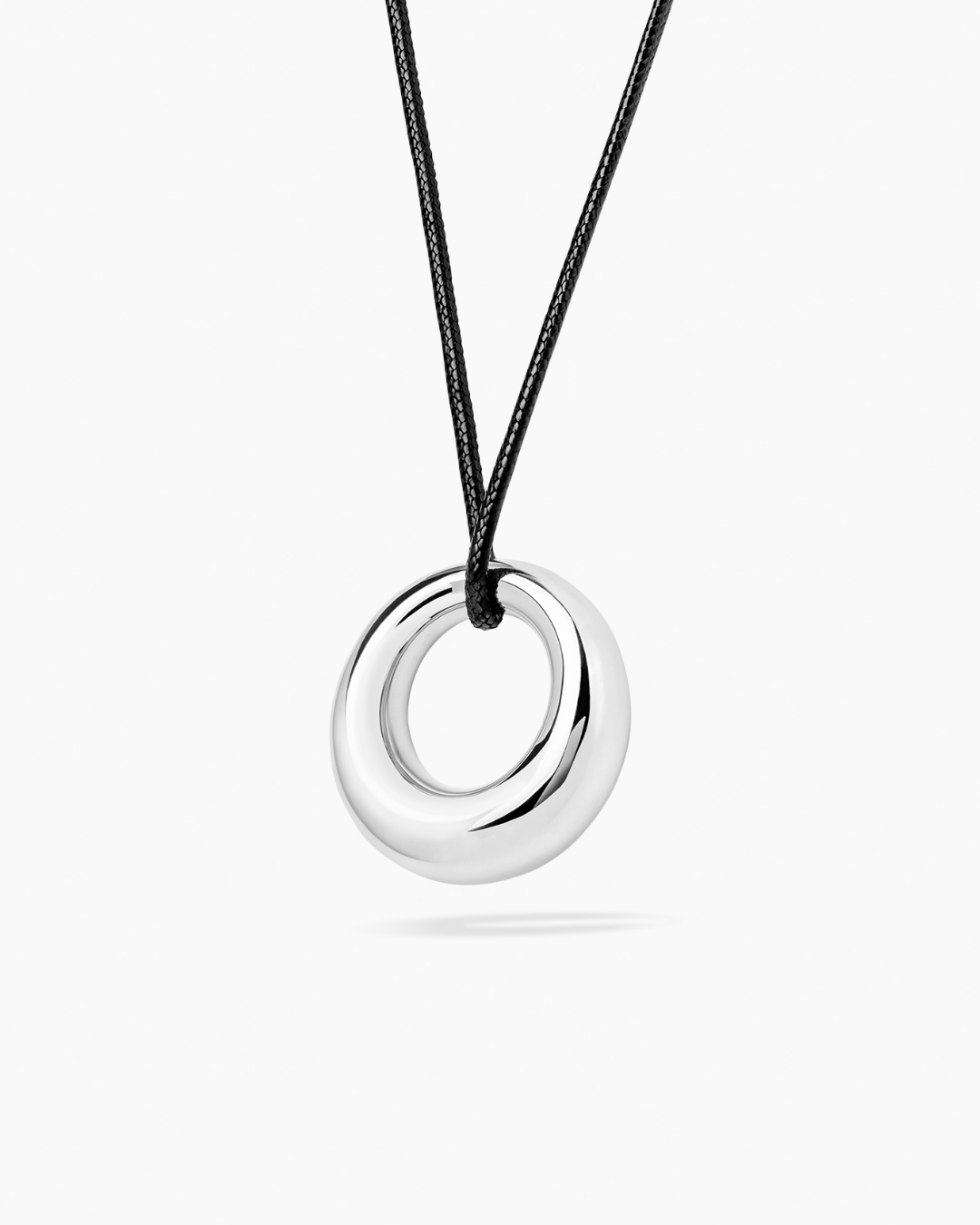 The Orbit Necklace is a necklace made from 100% recycled brass, featuring a shiny pendant available in both gold and silver. The necklace can be tied in different ways, making it easy to adjust to your style or the occasion you're wearing it for.