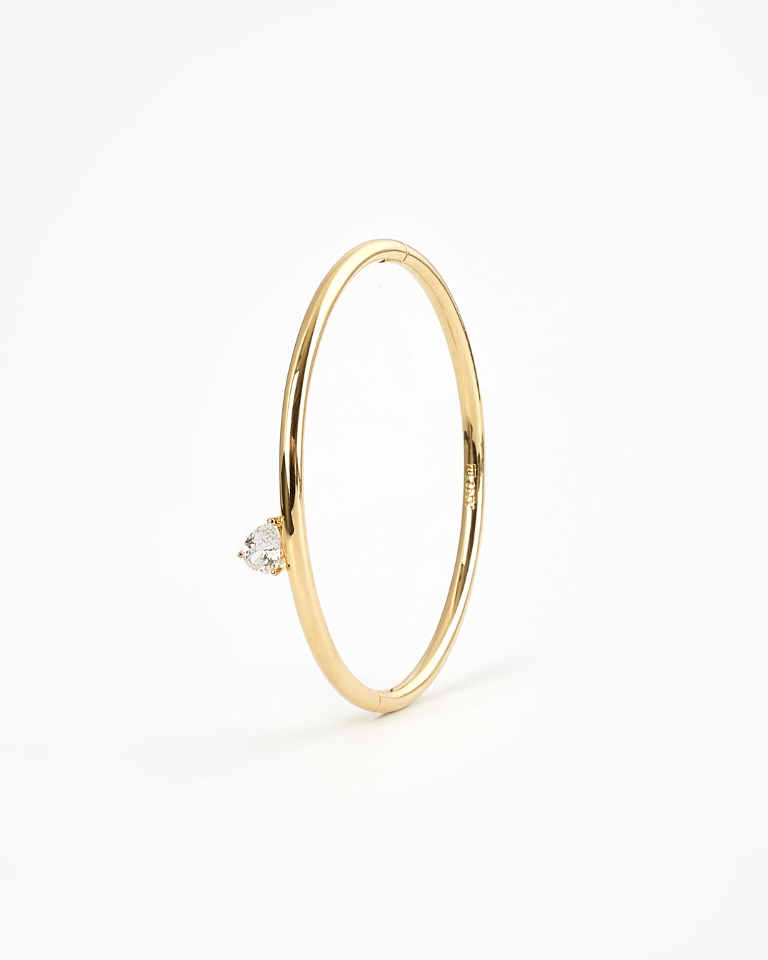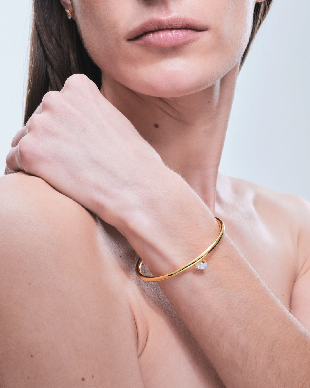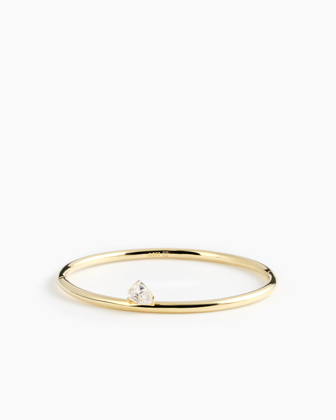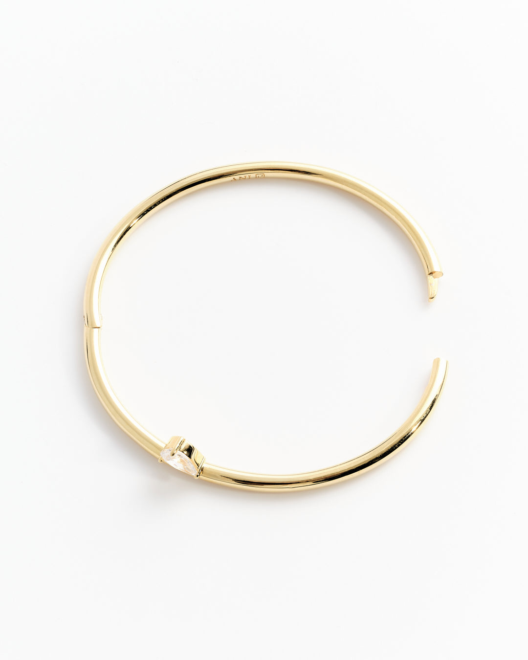 A cuff bracelet in 100% recycled brass with a pear-shaped cubic zirconia stone.